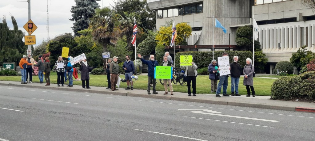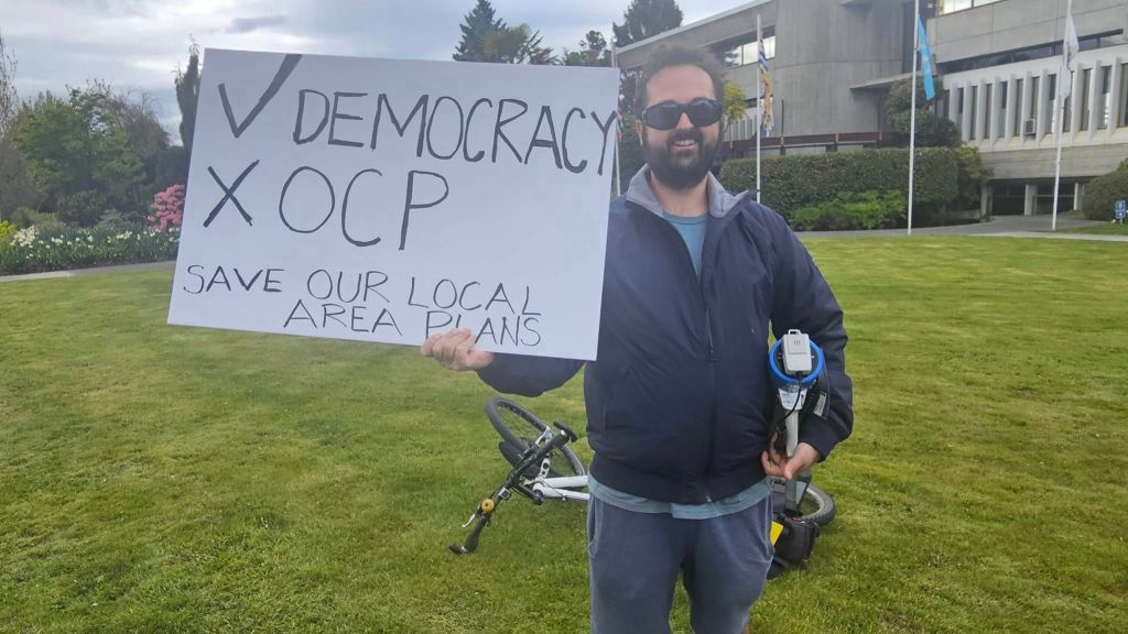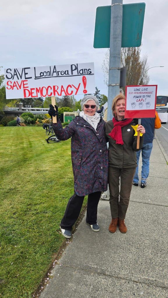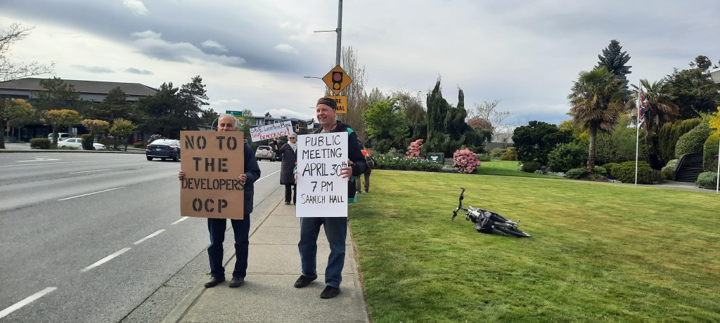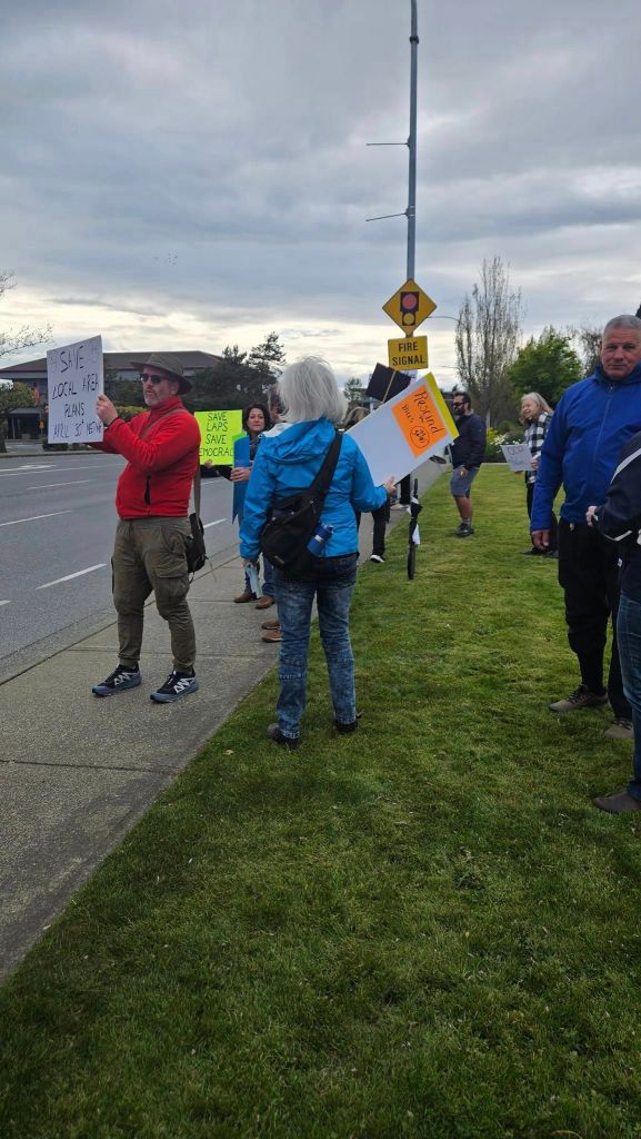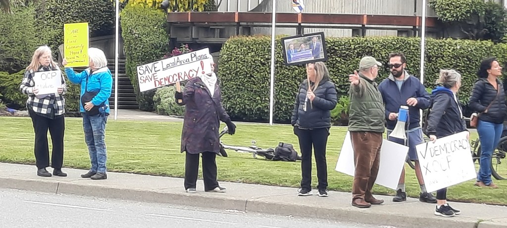 On April 24, 2024 Citizens protested outside Saanich City Hall over the imminent likely rendering of their Local Area Plans to be legally non-binding. This is set to be accomplished by Council not including the LAPs in the new proposed Official Community Plan (OCP) Bylaw, the final hearing for which was to take place at the Tuesday April 30 public hearing.
