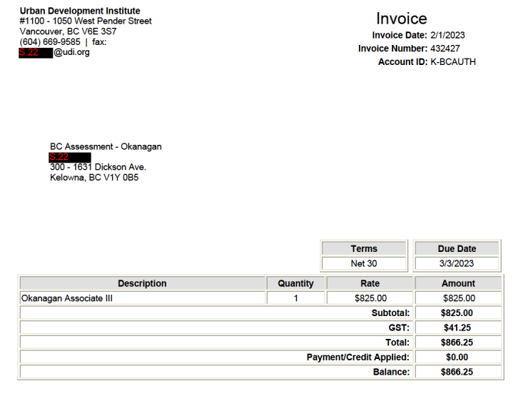 Also in previous years, it was an Associate III membership that was being paid for by BC Assessment to the UDI Okanagan. This was a membership renewal, ergo it was an Associate III membership in the UDI Okanagan that BC Assessment paid for this year (2024).