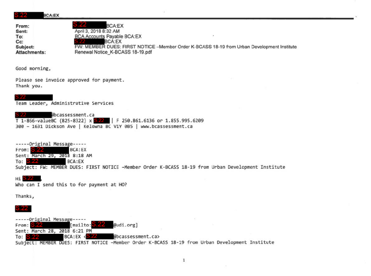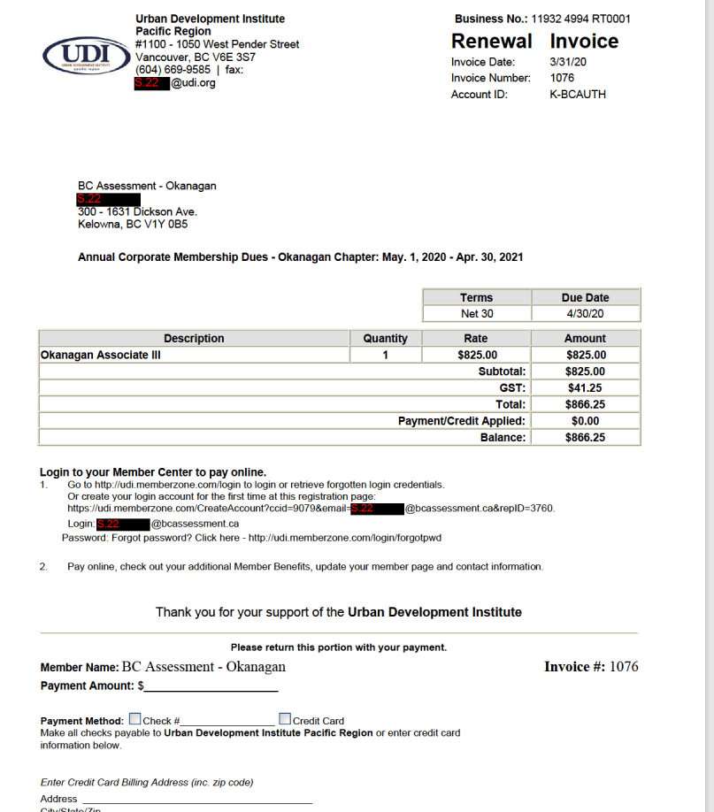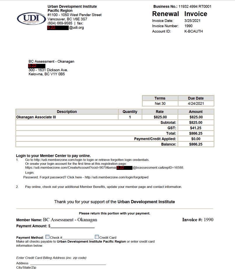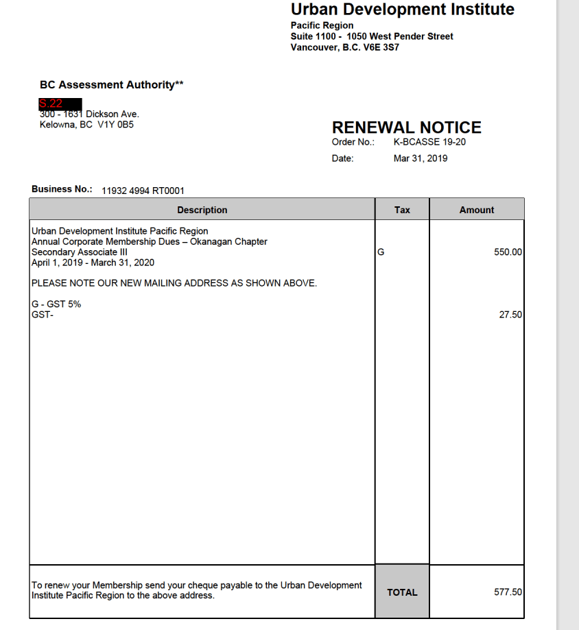Note: The UDI was kindly asking for BC Assessment to “renew your Membership” for its “Annual Corporate Membership Dues”. At this stage, BC Assessment was paying for a Secondary Associate III membership with the UDI. They would in subsequent years upgrade that to an Associate III membership (non-secondary) with the UDI with a significantly higher price tag.