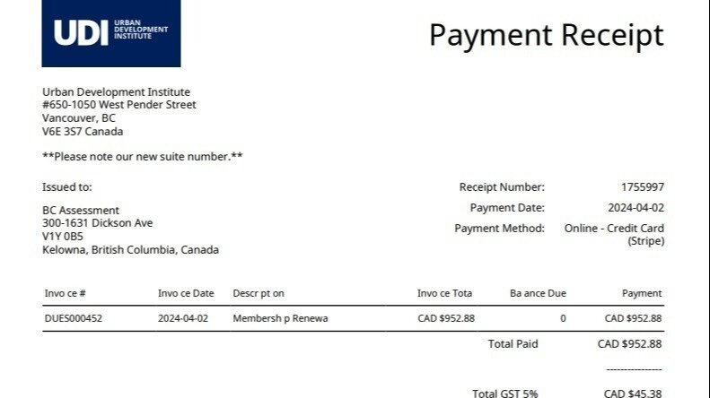Attached to the email that I had sent was a copy of the receipt showing BC Assessments’ paid membership renewal with the Urban Development Institute made on April 2, 2024: