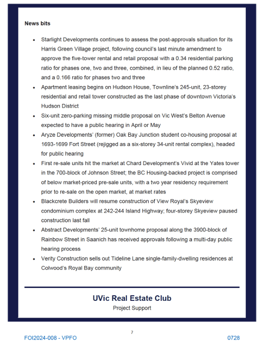As revealed by the FOI, a UDI Newsletter from March 2023 listed a number of development projects, including those that recently have had, and would soon have public hearings. Below this was written “UVic Real Estate Club Project Support”.