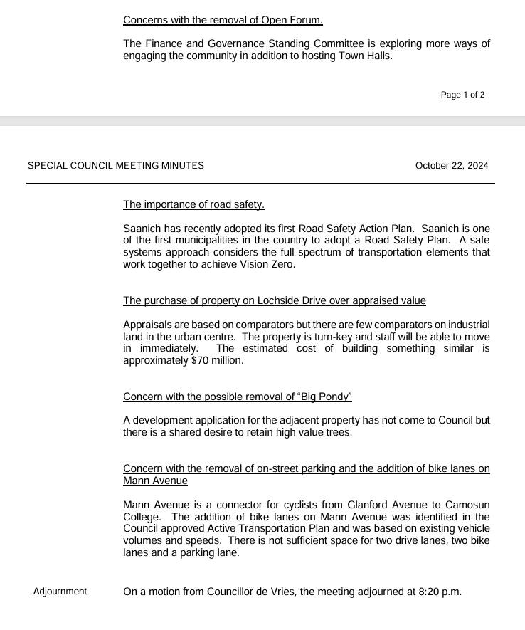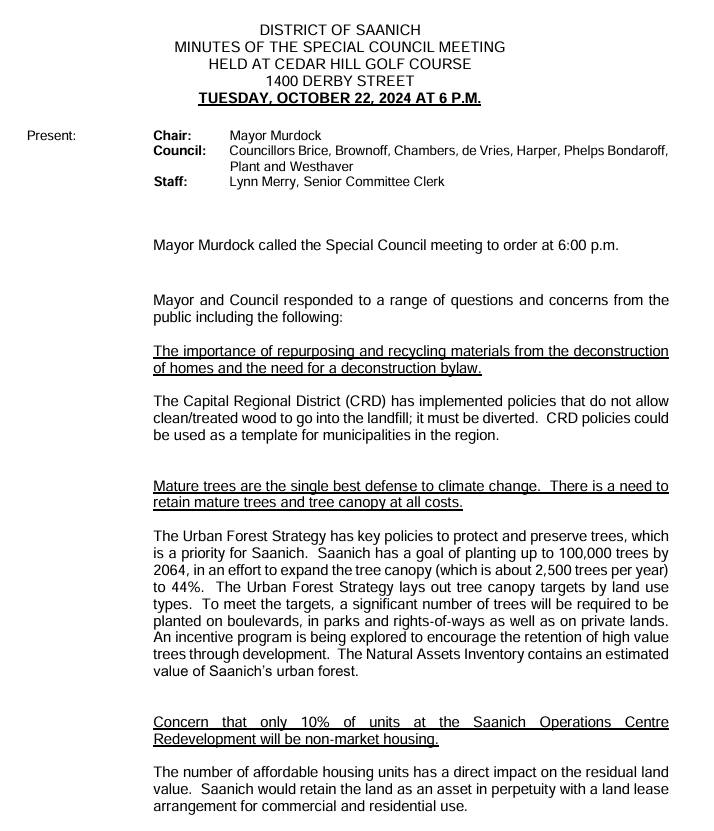 Saanich posts amazingly thin minutes at just 2 pages for a 2+ hour Saanich Council Town Hall meeting (Oct 22, 2024)
