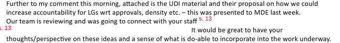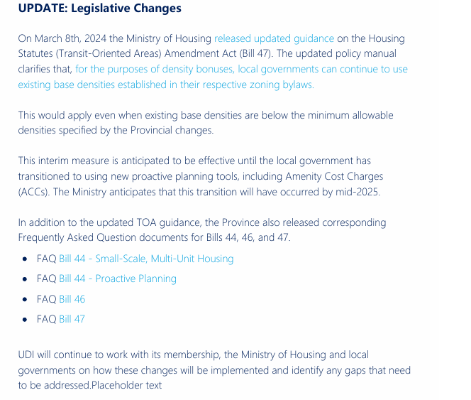 Not only did the UDI lobby for the contents that would become Bill 47, but in their March 2024 Newsletter (FOI: OOP-2024-40863 p.318) they mentioned that they were working with the Province to help implement it.