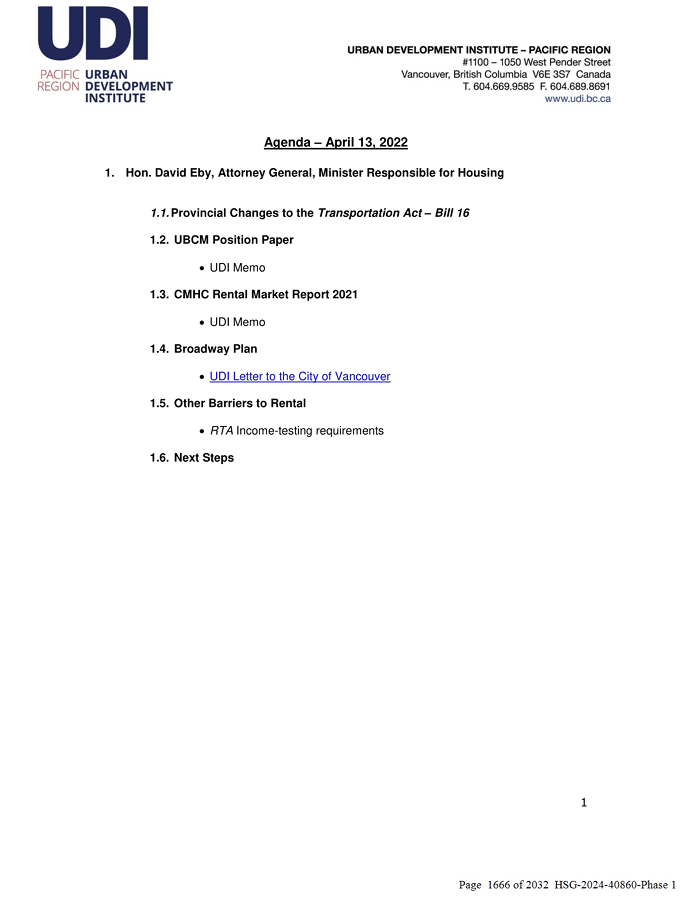 Appendix II: The full UDI letter from McMullin to Eby, dated March 12, 2021 and what appears to be the agenda for a UDI meeting with Eby that day.