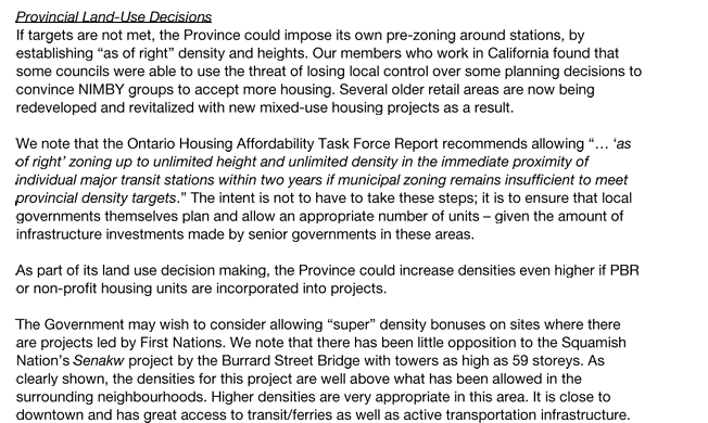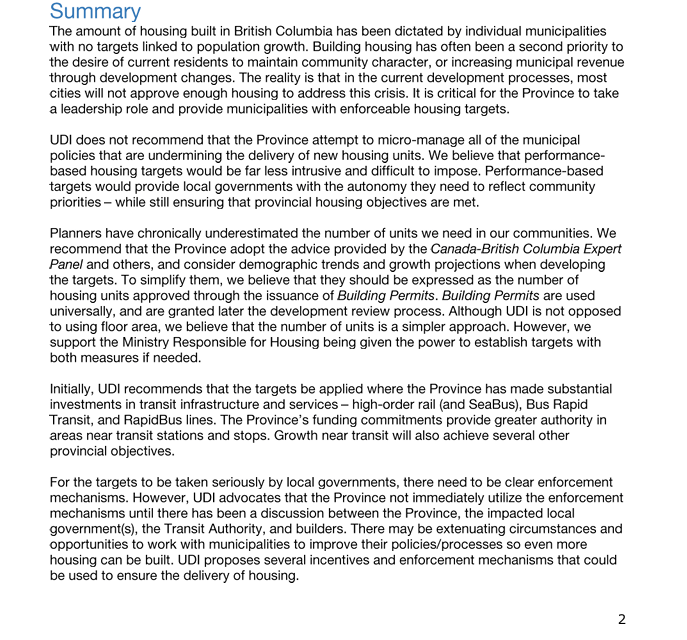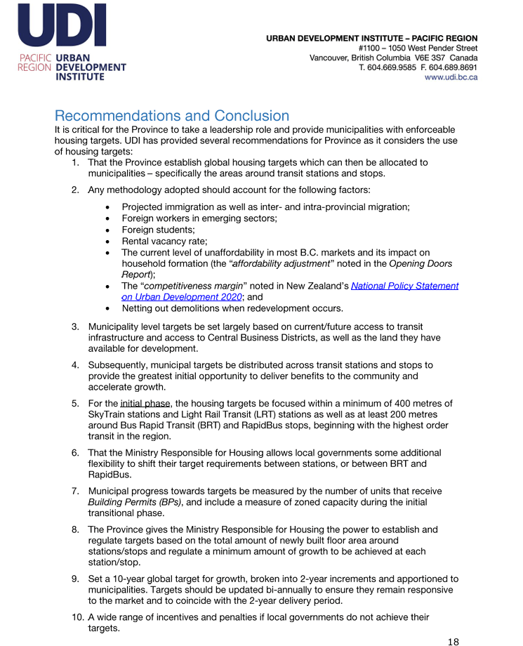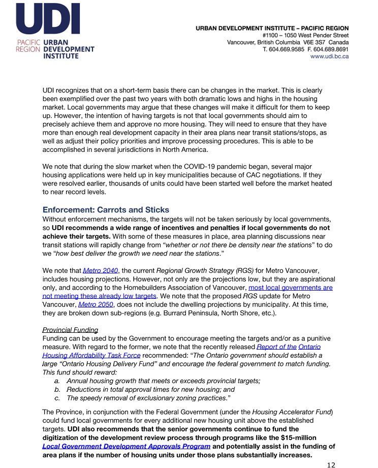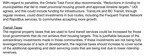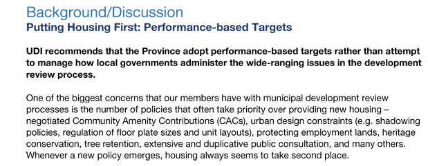 Performance-based housing targets are vaguely described in the next paragraph, mentioning that the “targets would provide local governments with autonomy”, which sounds quite benign, but the conclusion at the bottom of the summary sounds quite different: “For the targets to be taken seriously by local governments, there need to be clear enforcement mechanisms. however, UDI advocates that the Province not immediately utilize the enforcement mechanisms until there has been a discussion between the Province, the impacted local government(s), the Transit Authority, and builders. There may be extenuating circumstances and opportunities to work with municipalities to improve their policies/processes so even more housing can be built. UDI proposes several incentives and enforcement mechanisms that could be used to ensure the delivery of housing.”