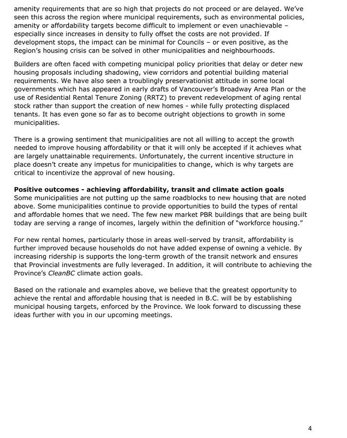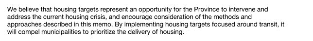 The letter immediately continued with a summary that stated: “It is critical for the Province to take a leadership role and provide municipalities with enforceable housing targets”.