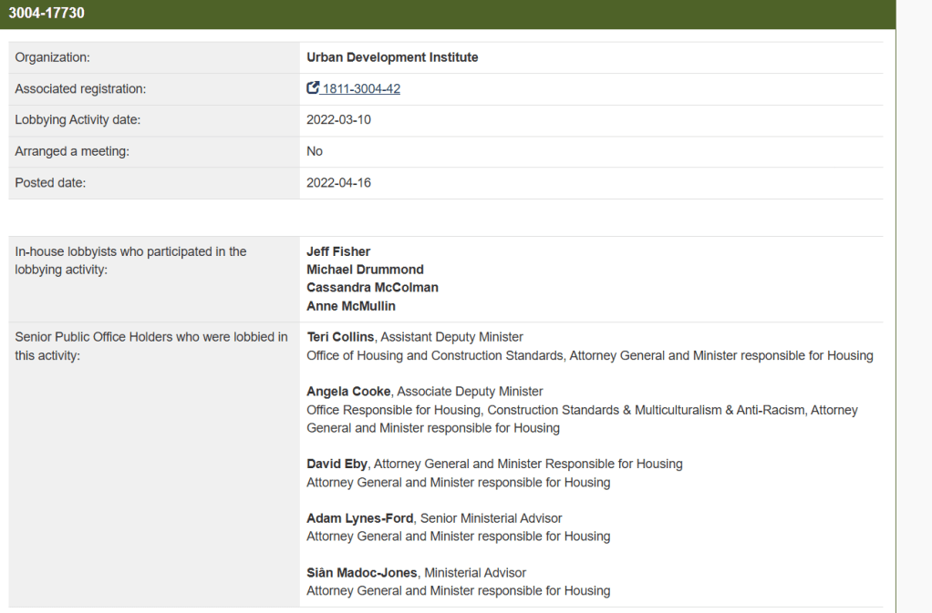 Here is a copy of the UDI’s Lobbying Activity Report 3004-17730 on the BC Lobbyists Registry for lobbying activity dated to March 10, 2022, about a month previous to the briefing paper for Cullen: