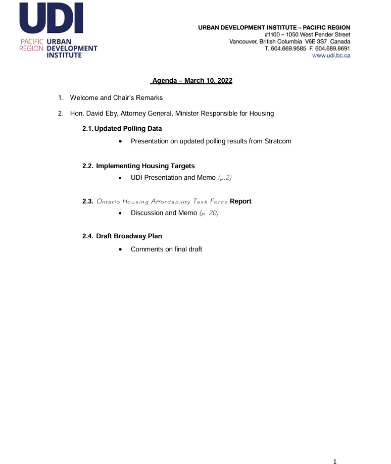 The following is a message sent from the UDI to Eby about the upcoming meeting on March 10, 2022 (From the Ministry of Housing FOI p.1629)
