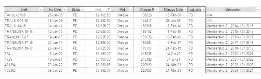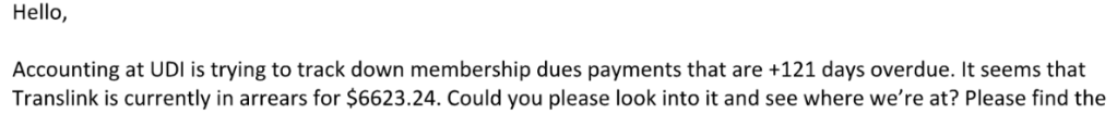 Apparently even the UDI have been having difficulty with TransLink’s accounting for their membership dues. A message from the UDI to TransLink regarding “Outstanding Membership Dues Invoices” was sent in March of 2023: