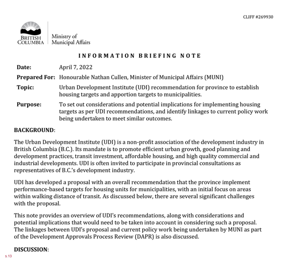 In the first of the two images shown of the April 7, 2022 Ministry of Municipal Affairs Briefing, the background of the information briefing prepared for Minister Cullen, mentioned “performance-based housing targets”. “UDI has developed a proposal with an overall recommendation that the province implement performance-based targets for housing units for municipalities.”