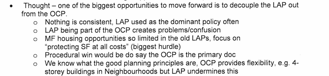 The removal of the Local Area Plans (LAPs) from the OCP Bylaw, thus decoupling them and rendering the LAPs legally non-binding, took place 2 years later in the spring of 2024