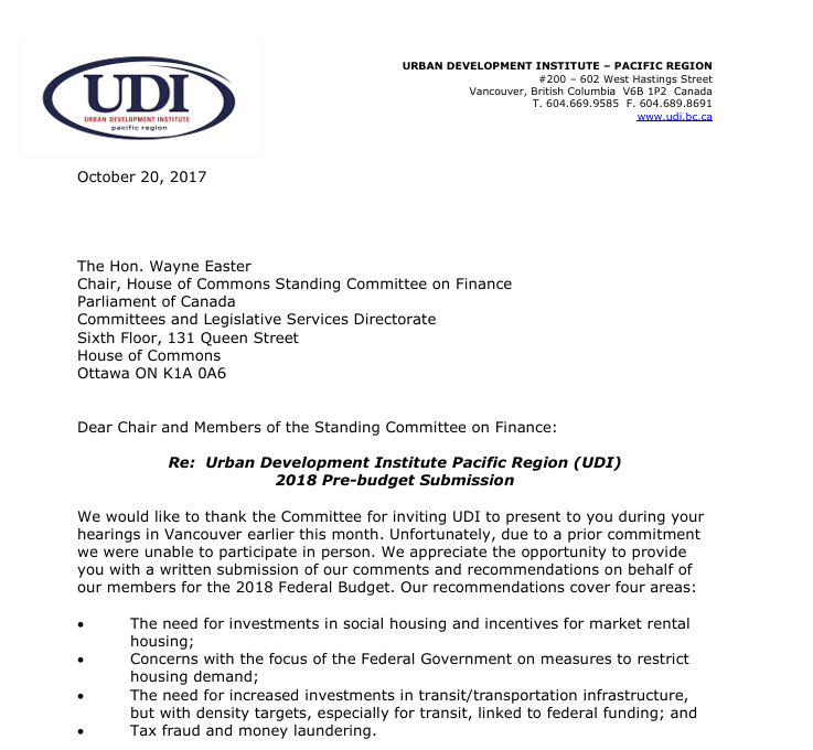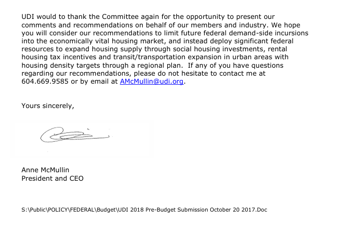 The 2017 letter from the UDI to the federal government can be read in full at this link: [October 20, 2017 UDI letter to the Federal Goverment] from the House of Commons website ourcommons.ca