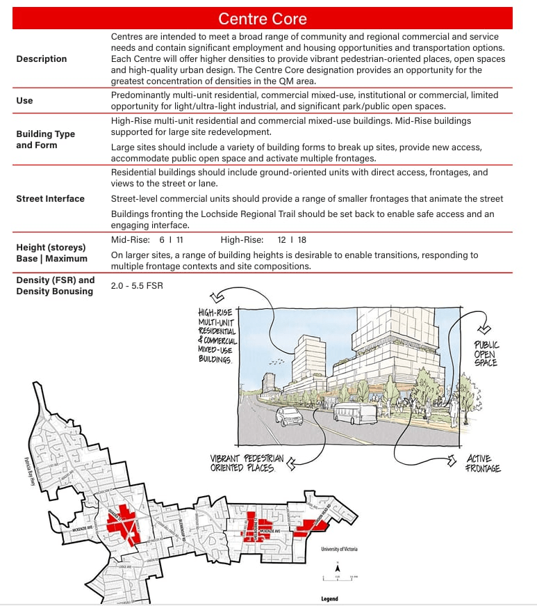 Note proposed mid-rise zoning is listed from 6-11 storeys and proposed high-rise zoning is listed as up to 18 storeys, although note that the new Saanich OCP adopted this year, also has provisions for density bonuses, which could see as high as at least 20 storeys in such areas.