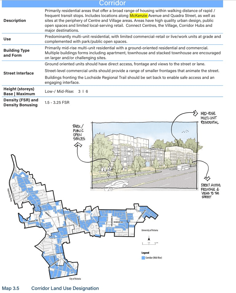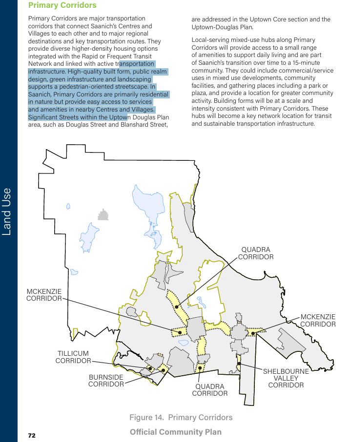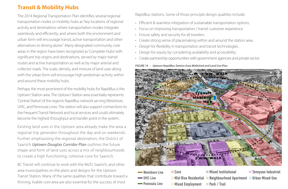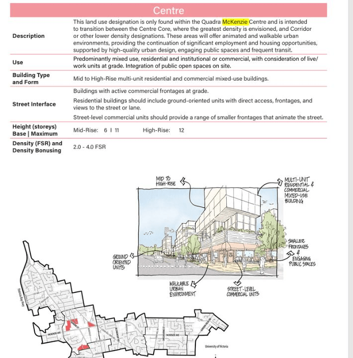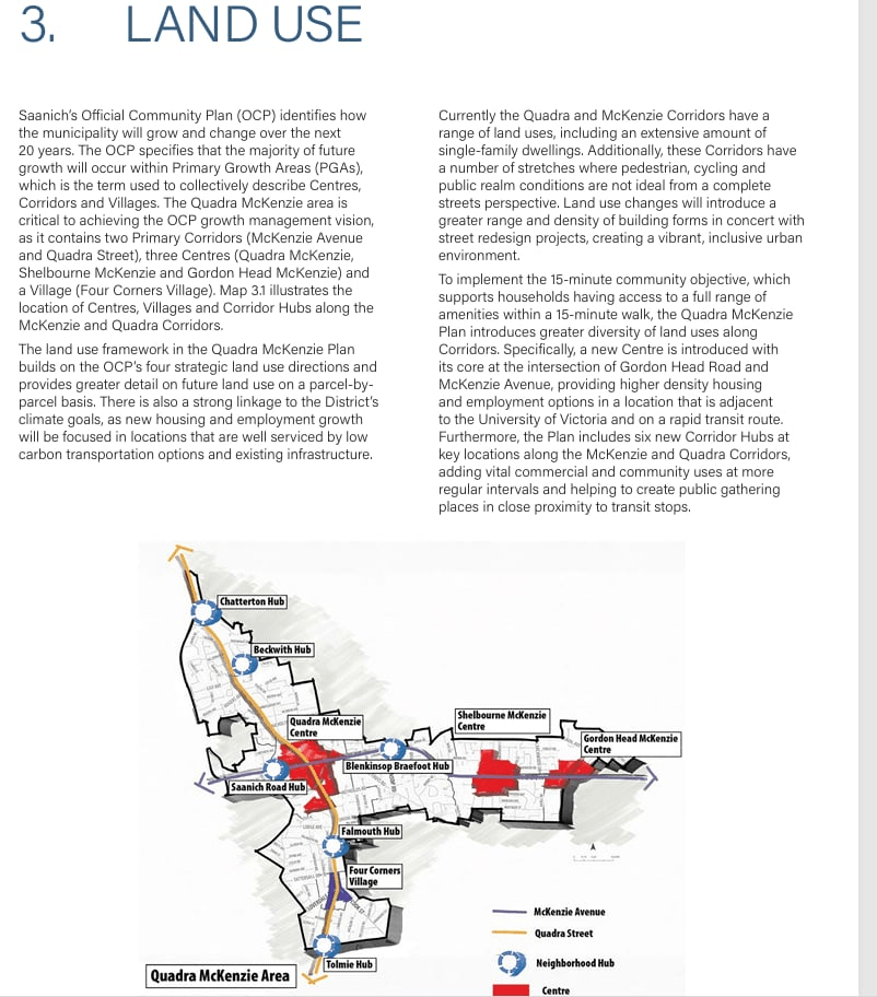 The following are sections excerpted from Saanich’s Quadra McKenzie Draft Plan, from which can be discerned the relation between Centres and Corridors to BC Transit’s plans for Quadra and McKenzie. Overlaps between Saanich’s and the UDI’s plans, as well as to Bill 47 should also be noted.
