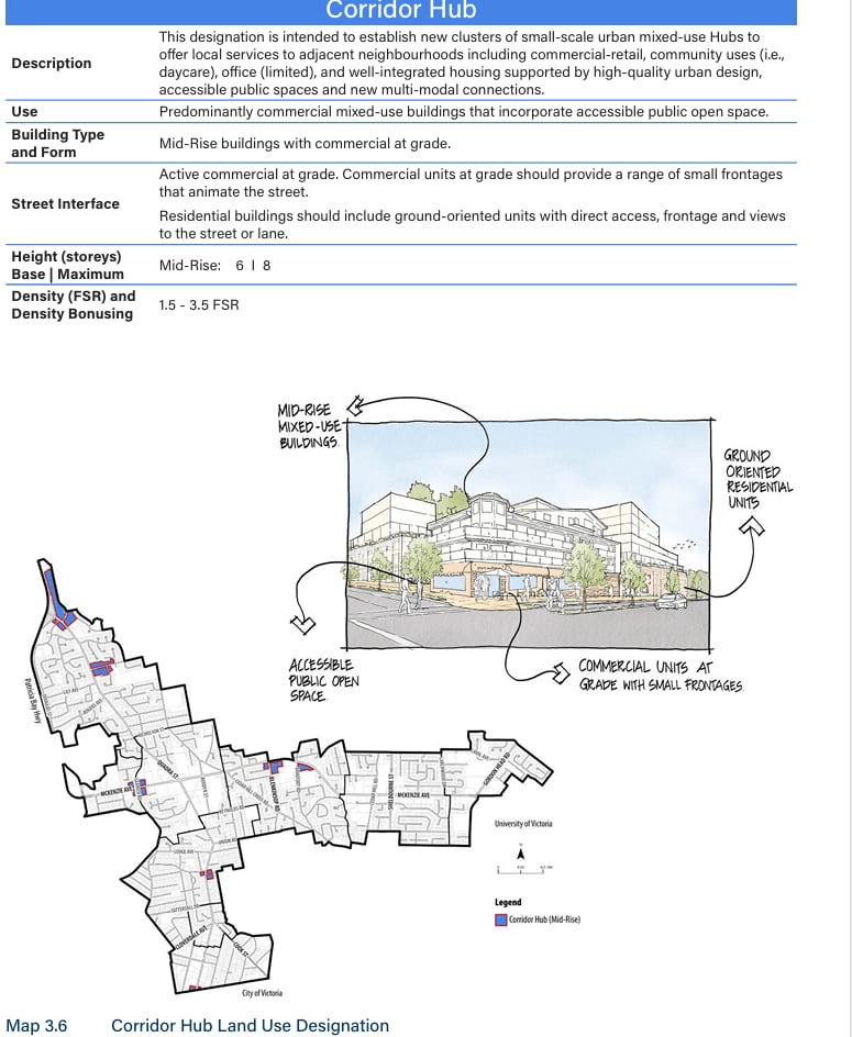 The following excerpt regarding so-called corridor hubs with proposed up to 6-8 storey zoning (but which as mentioned previously could actually go higher with potential density bonusing in the OCP) is from page 39 of the Draft Plan :