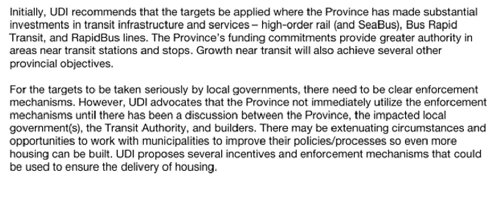 The UDI prescribed to the Province harsh medicines for local governments that might dare to not go along with the UDI’s agenda of forced housing targets along rapid transit corridors: