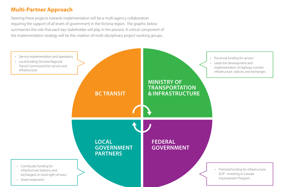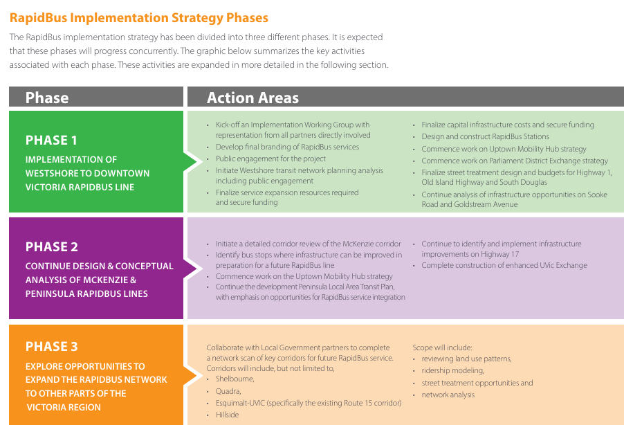BC Transit has collaborated with municipal, regional and provincial partners to develop the Victoria Regional RapidBus Implementation Strategy. [The link is no longer active, but the archived link is, as posted previously]