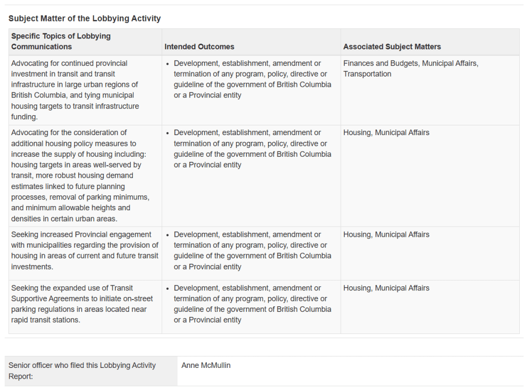 The following is a copy of the UDI’s Lobbying Activity Report 3004-17730 on the BC Lobbyists Registry for lobbying activity dated to March 10, 2022: