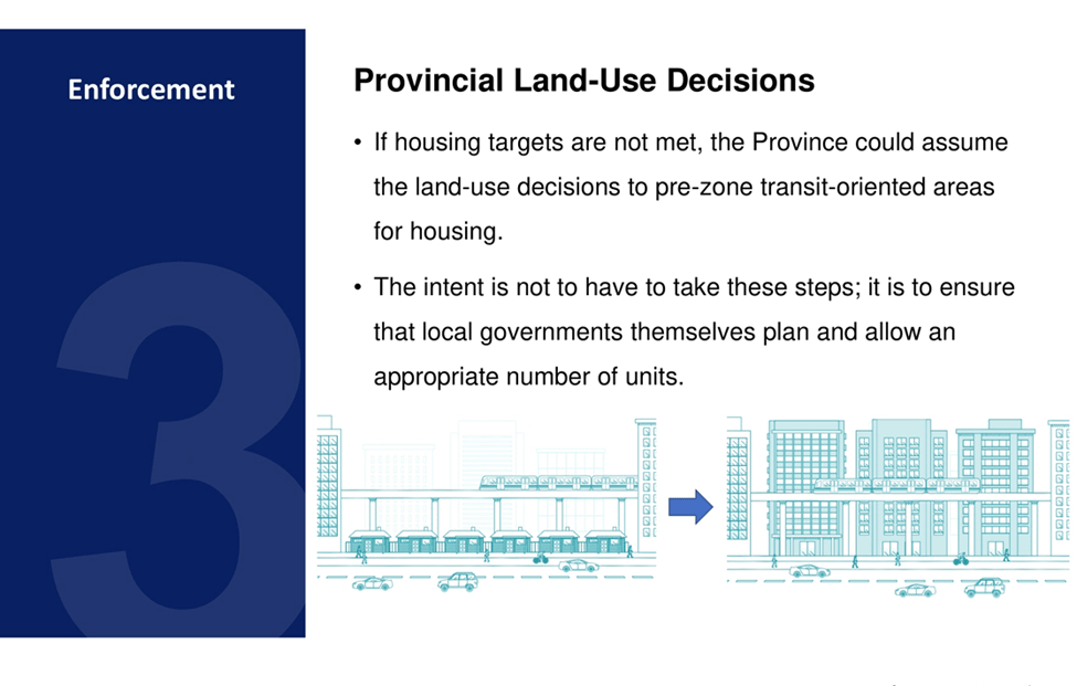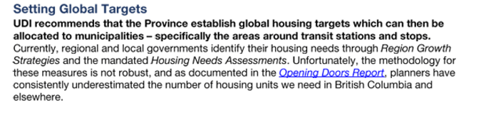 The UDI offered a set of tools that they suggested to Attorney General and Minister Responsible for Housing David Eby (now Premier). These included the possibility and/or threat of meting out punishments to municipalities that fail to densify fast and high enough, according to the UDI’s agenda of “enforceable” housing targets set by the Province upon Local Governments.