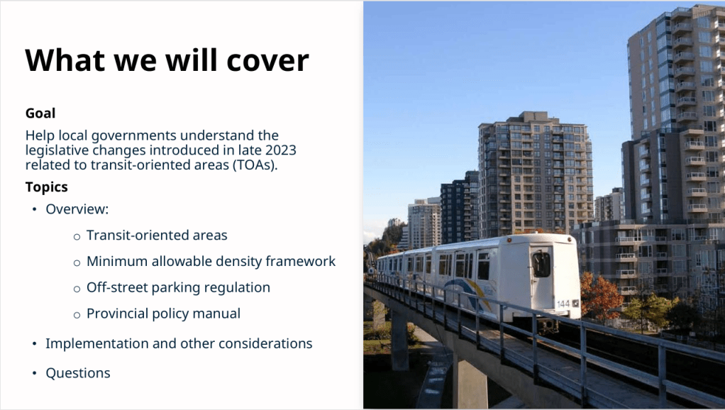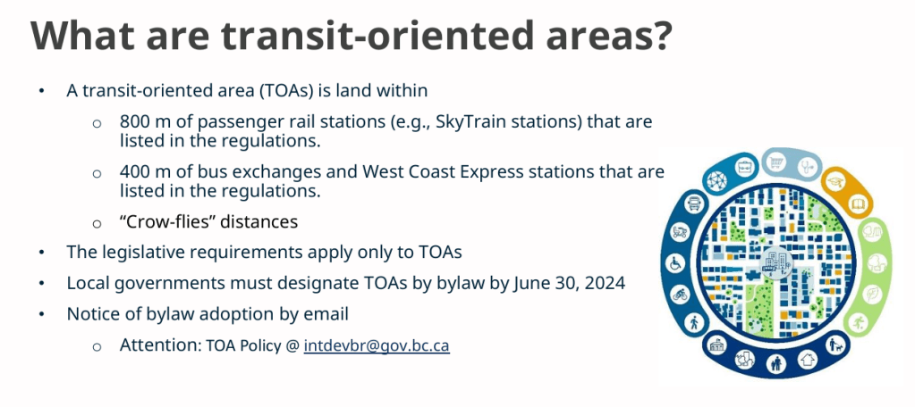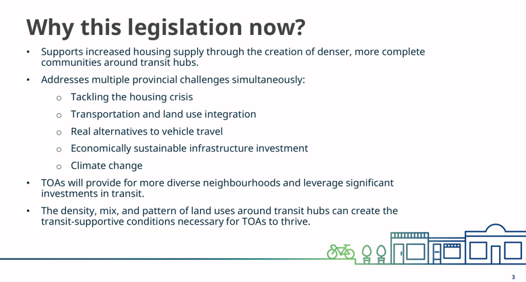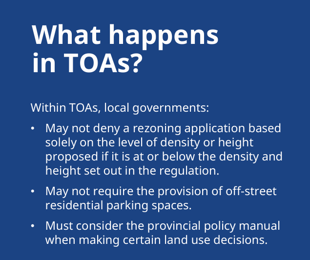 The Province initiated Transit Oriented Development Areas (TODs) and Transit Operating Areas TOAs, part of Bill 47 tabled in 2023. The difference between them is slim.