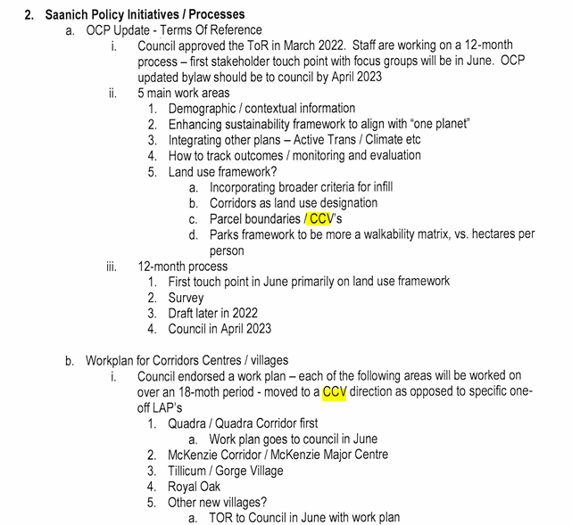 Saanich’s CCV planning has gone back many years, and has been a way of rezoning Saanich in order to fulfill its obligations under the CRD’s Regional Growth Strategy.