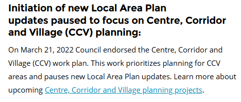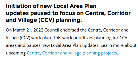 Note that the pausing of the Local Area Plans (LAPs) directly corresponded to the endorsement of the CCV work plan. This happened just before BC Transit released its RapidBus plans which synchronize with the CCV planning.