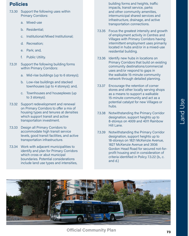 “To implement the 15-minute community objective, which supports households having access to a full range of amenities within a 15-minute walk, the Quadra McKenzie Plan introduces greater diversity of land uses along Corridors. Specifically, a new Centre is introduced with its core at the intersection of Gordon Head Road and McKenzie Avenue, providing higher density housing and employment options in a location that is adjacent to the University of Victoria and on a rapid transit route. Furthermore, the Plan includes six new Corridor Hubs at key locations along the McKenzie and Quadra Corridors, adding vital commercial and community uses at more regular intervals and helping to create public gathering places in close proximity to transit stops.”