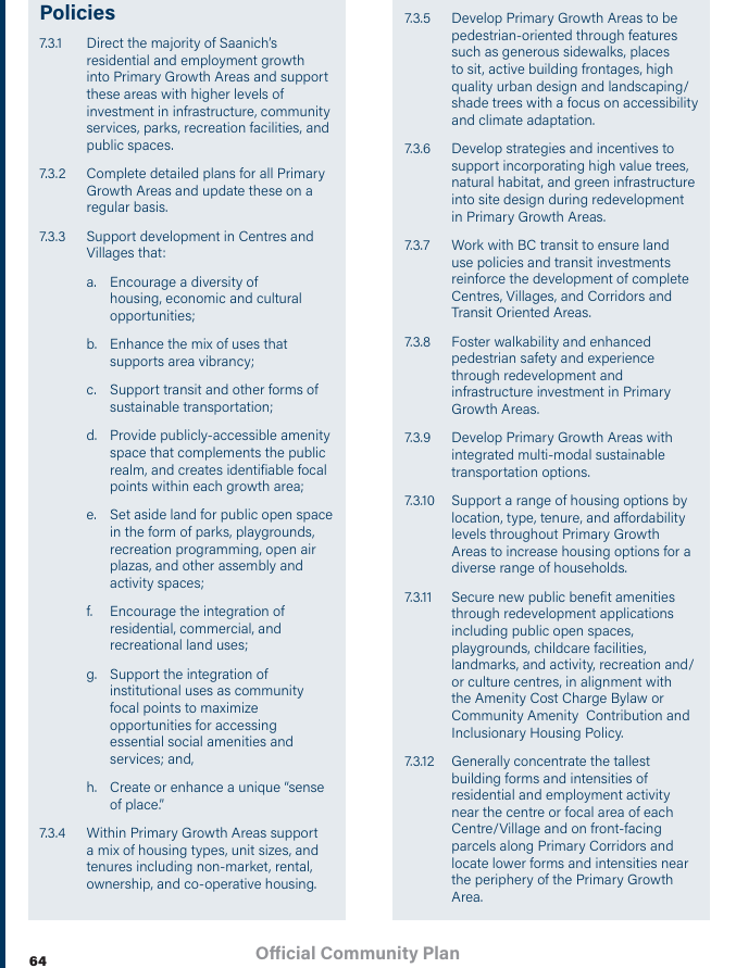 This plan was synchronous with Saanich’s Centre Corridor and Village (CCV) work plan, decided on only a few months earlier. The new CCV work plan corresponded directly to the pausing of Saanich’s Local Area Plans. The majority council decision to pause the LAPs and the decision to endorse the CCV work plan took place simultaneously.
