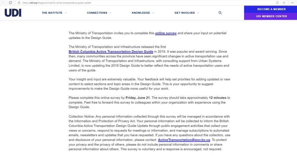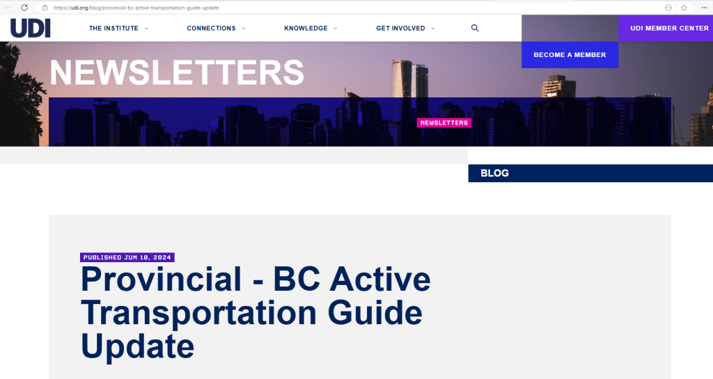 In June of 2024, the UDI posted on their website the Province’s the survey for the update to the Active Transportation Design Guide, once again with the Ministry of Transportation being aided in their work by Urban Systems.