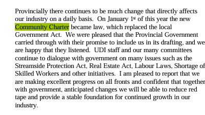 Why were the UDI so enthusiastic about helping the Province draft the Community Charter in the first place? Shouldn’t the Province have kept such a powerful lobby for real estate and development at an arm’s length from the Charter’s start?