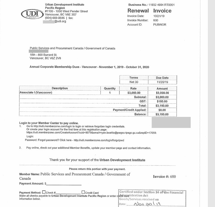“I would like to see records showing the year that Public Services and Procurement Canada began to pay the Urban Development Institute (UDI) for membership, and also communications, or other data showing the reasons and those responsible for that initial decision. All records showing invoices and receipts for payment by the PSPC to the UDI. All communications regarding payments between the PSPC and the UDI. All records related to PSPC membership in the UDI.