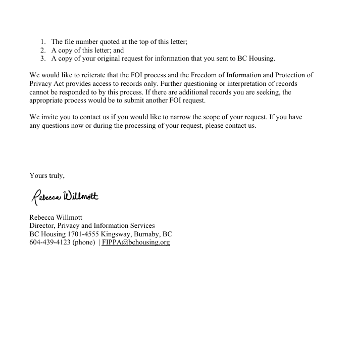 BC Housing responded to my inquiry by recommending that I contact Corporate Services and “Unfortunately, Corporate Services does not have an email address and can only be contacted through the phone number provided.” It appeared that BC Housing didn’t want to provide an answer in writing, a pattern made apparent previously by various other crown corporations and other government entities.