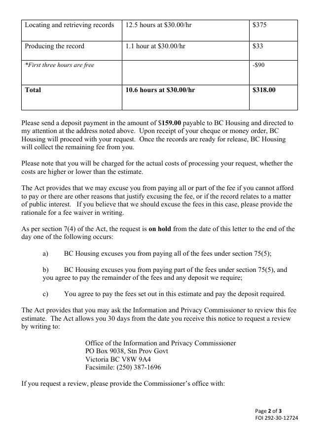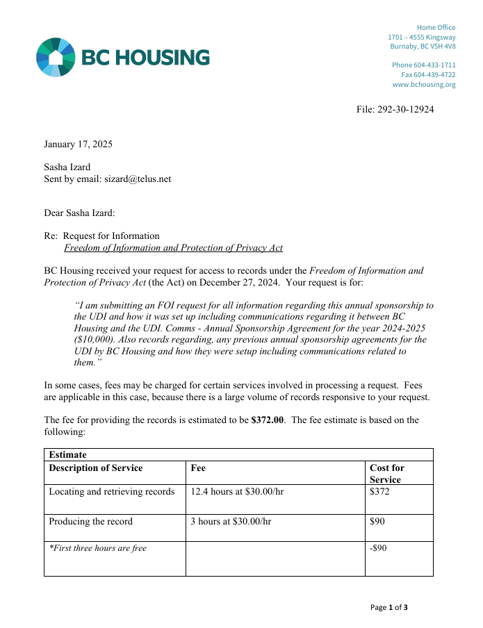 BC Housing estimates charging an outrageous $1768.50 combined, for 3 Freedom of Information Requests to do with basic financial and other information regarding payments to a registered lobbying organization that represents development and real estate interests.