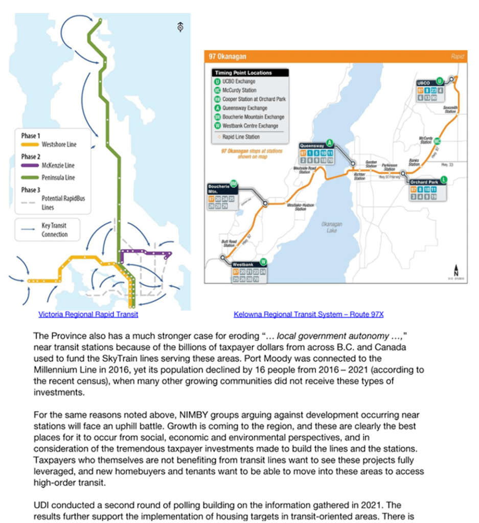Appendix 2: Excerpt from the March 10, 2022 UDI lobbying letter sent to the former Minister Responsible for Housing as revealed by Freedom of Information. The letter showed a map including the proposed McKenzie and potential Quadra rapid bus lines, along with talk of eroding local government autonomy and a coming uphill battle for “NIMBYs” in such areas.