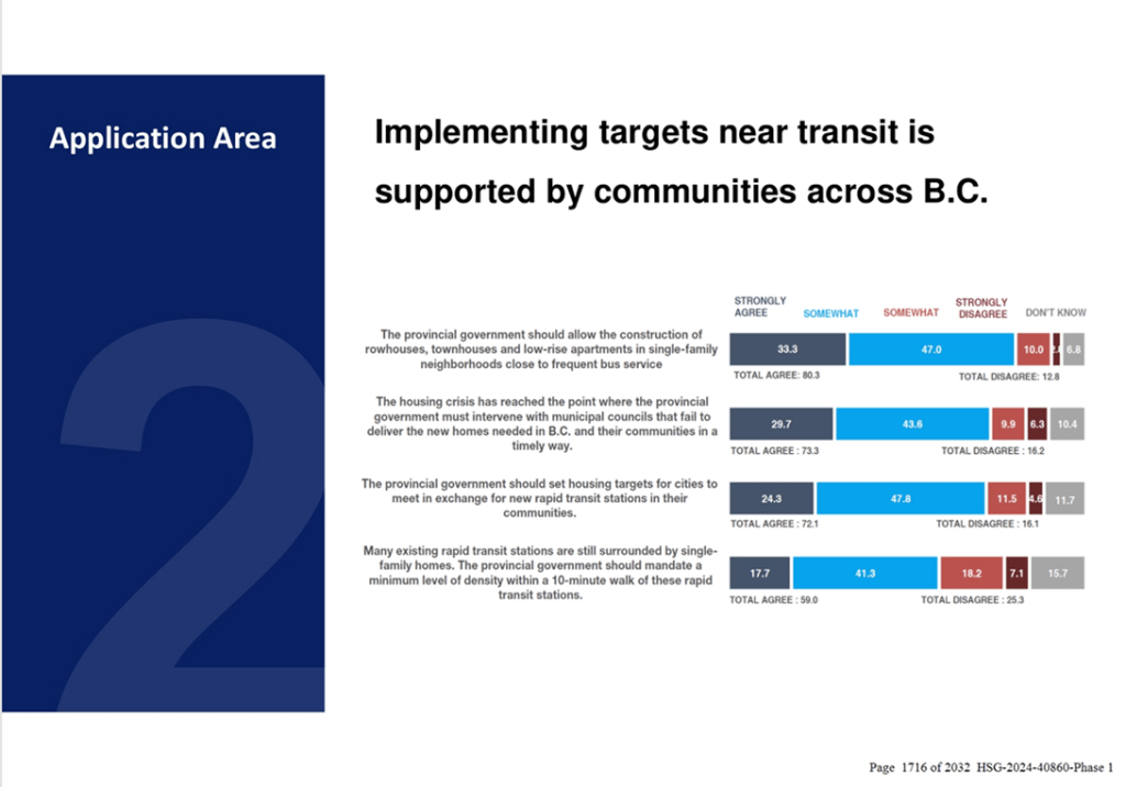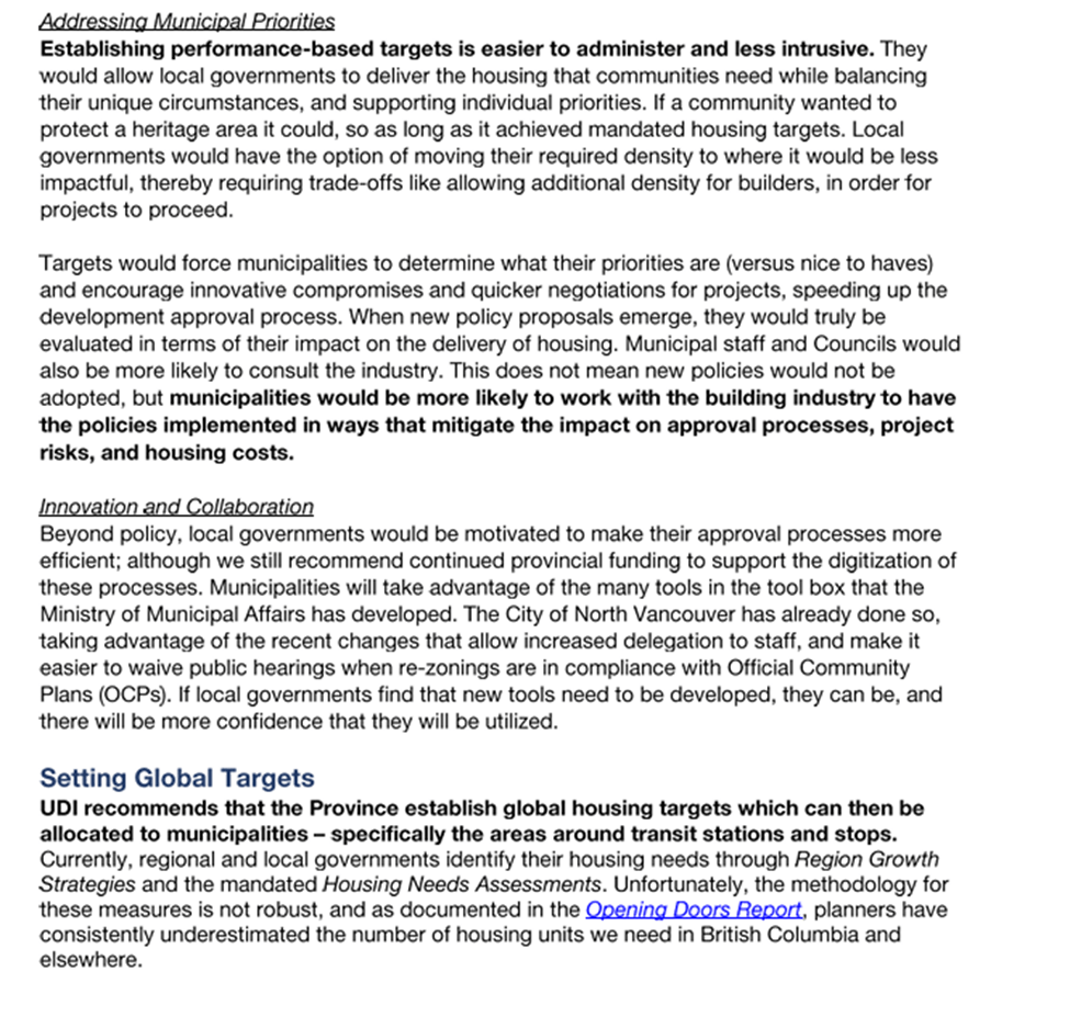 The content also showed that the UDI, which is a registered lobbying organization had included the proposed McKenzie rapid bus line in a lobbying presentation and accompanying letter to the former Minister Responsible for Housing, while advocating for pre-zoning around such areas and applying Transit Oriented Areas to them (The Quadra McKenzie area has a TOA in the new Official Community Plan, although this TOA from what I understand is not Provincially mandated). On top of that the UDI offered a carrot and stick approach to local governments, that could see punishments made to municipalities that don’t comply quickly enough to Provincial mandatory housing targets in such areas. (See Appendix 4)