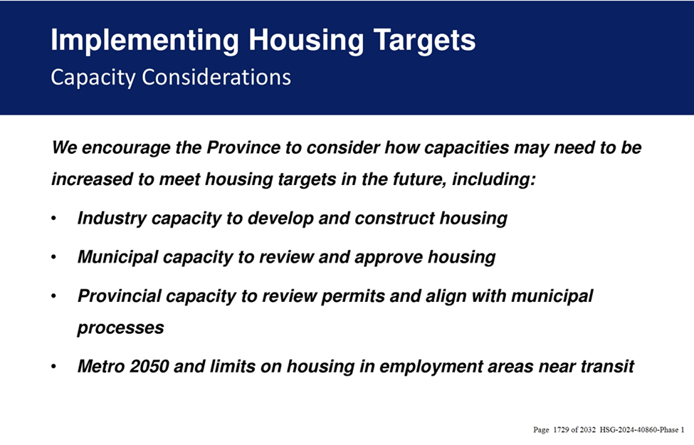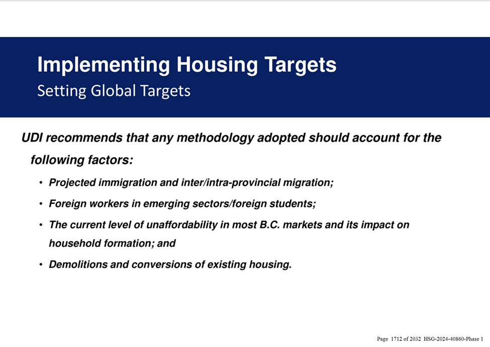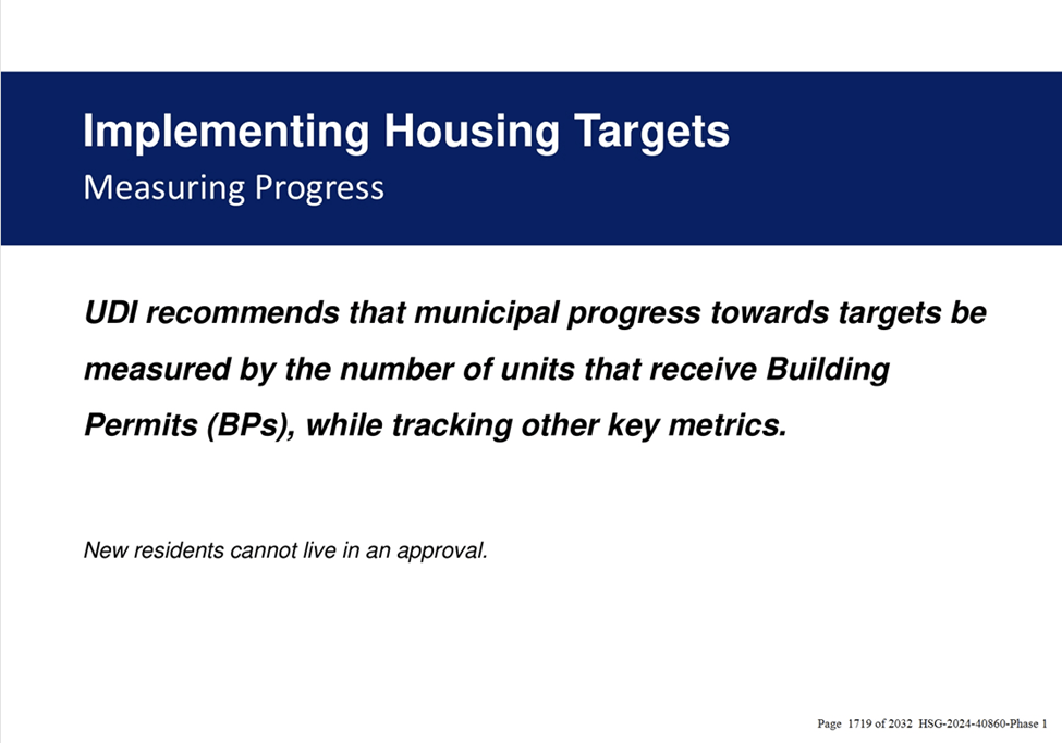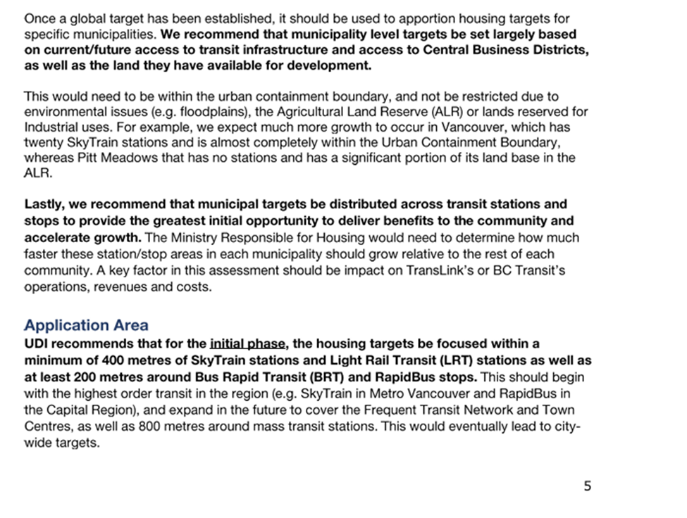 The letter and presentation called for “enforceable” housing targets along so-called rapid transit lines, and content that can be seen as the precursor to Bill 47, pushing density around transit-oriented areas. A carrot and stick approach was lobbied for, with various punishments suggested to be meted out to municipalities that do not build fast enough according to the UDI’s agenda, along designated transit areas.