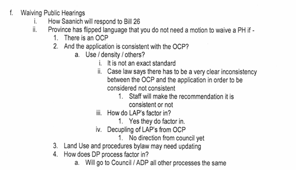 About 2 years after this meeting, on May 7, 2024 – The majority of Saanich Council voted to pass a new Official Community Plan (OCP) by unusually passing both third and fourth readings of the proposal that same evening, thus rendering a new OCP into existence on that date, while at the same time Saanich’s Local Area Plans (LAPs) were rendered legally non-binding by removing them from the OCP Bylaw (something yourself, the Mayor had referred to as “decoupling” the LAPs from the OCP. The new OCP wasn’t actually due until the end of 2025. Why was it as so many commented, rushed through so quickly?