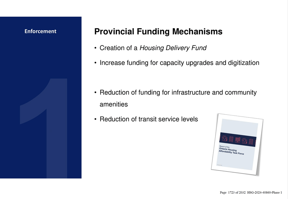 Proposed punishments included “reduction of funding for infrastructure and community amenities,” “reduction of transit services levels, “curtailing the regulatory powers of municipalities” that do not meet housing targets, that the “Province could assume land-use decisions to pre-zone transit-oriented areas for housing” and finally “using debt as an incentive” for municipalities to achieve their housing targets.