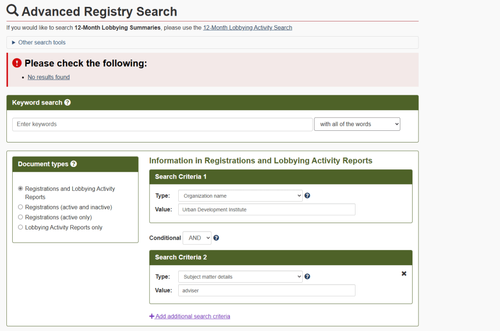 I used an advanced registry search in regard to Urban Development Institute and detail of subject matter “advisor”. Nothing was found: