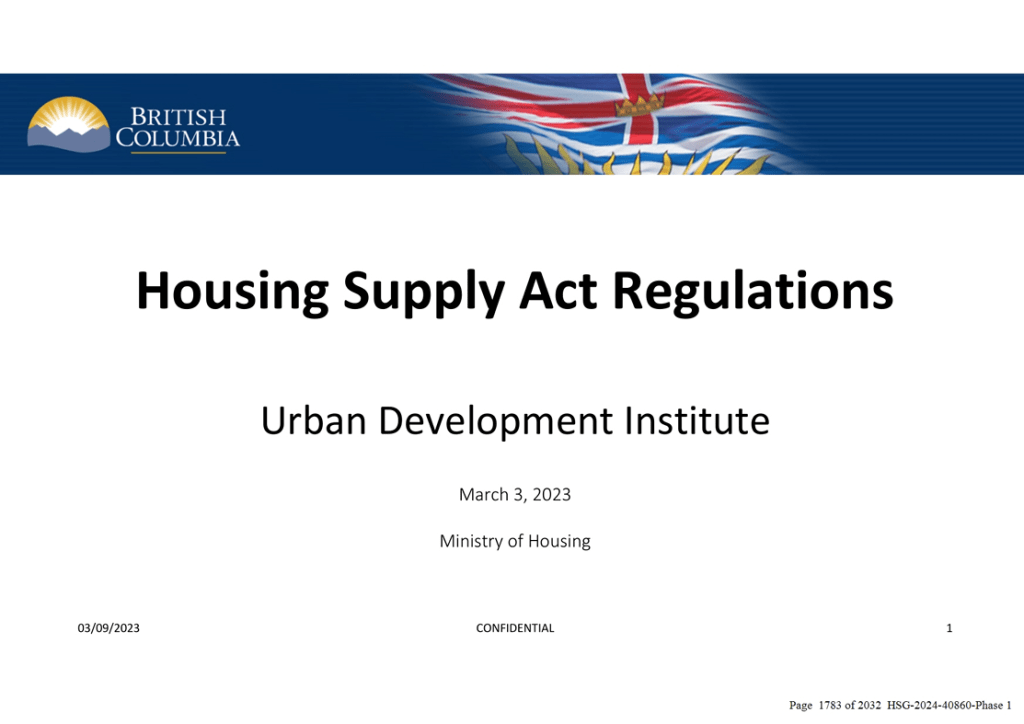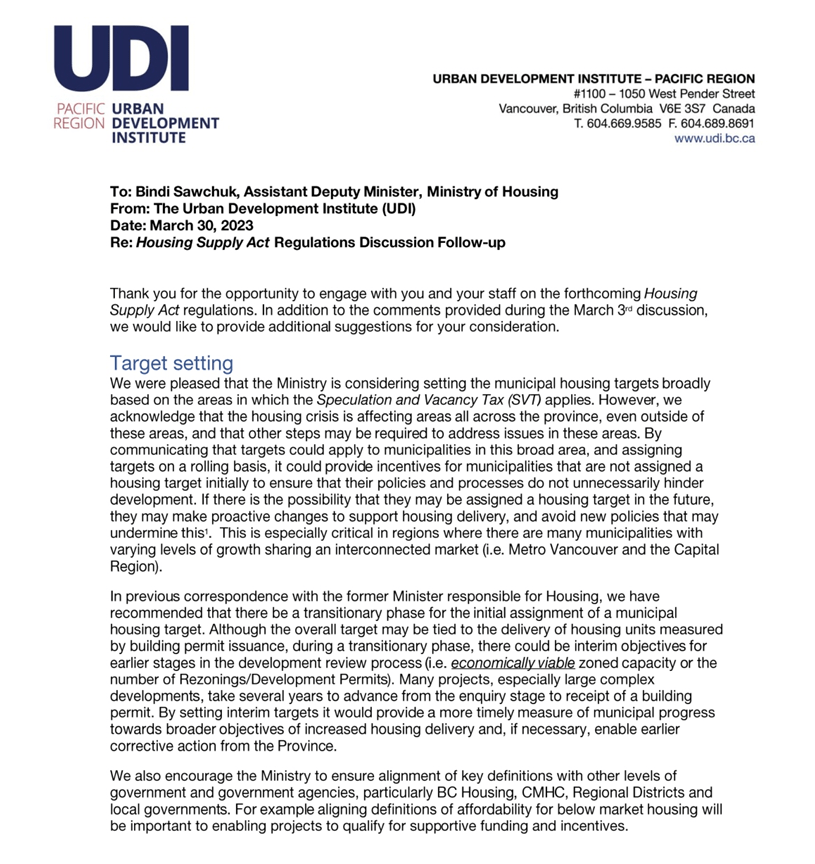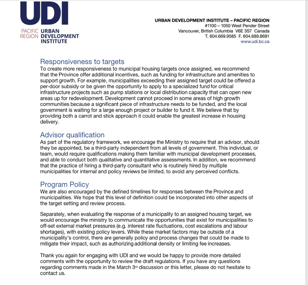 A letter from the Urban Development Institute (UDI) dated to the Ministry of Housing dated March 30, 2023 made recommendations in regard to an advisor should they be appointed in regard to the “Forthcoming Housing Supply Act Regulations” as it is put in the letter (below on the 2nd page under the heading “Advisor Qualification”).