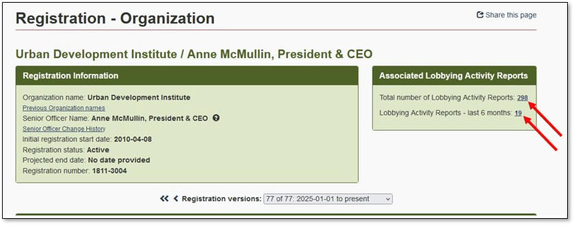 To review all of the Lobbying Activity Reports submitted by UDI, you can click either of the numbers located under the heading “Associated Lobbying Activity Reports” (screenshot below):
