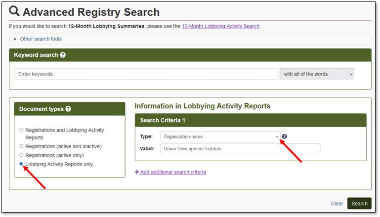 Alternatively, you can perform an Advanced Search of the Registry and narrow the search parameters for “Lobbying Activity Reports” and “Organization Name” (screenshot below):