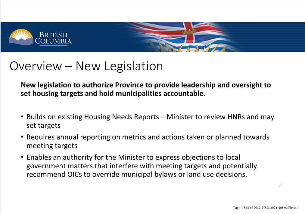 A year after the UDI’s lobbying presentation and letter to David Eby where they introduced the idea of “global targets”, the new housing Bills (43-47) delivering on the UDI’s demands were on their way to becoming a reality/implemented with the following being prepared by the government in conjunction with their UDI advisors: