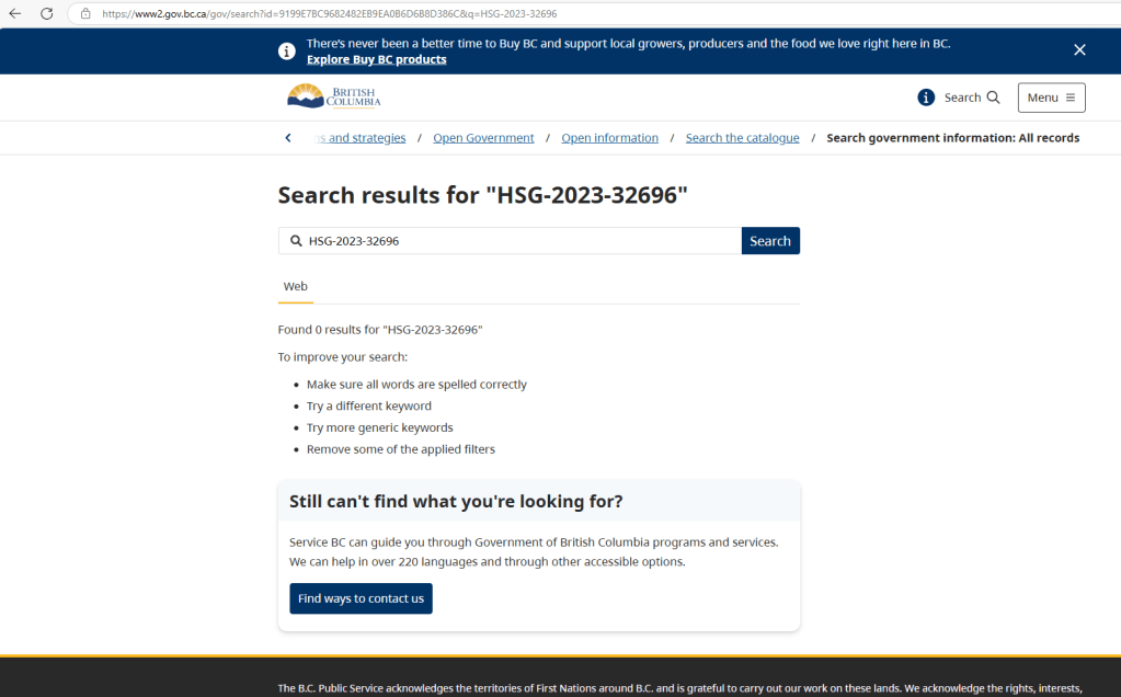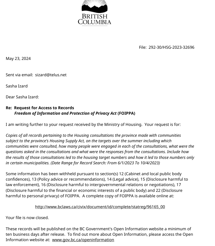 The Government of British Columbia has repeatedly failed to post Freedom of Information response on its so-called “Open Information” catalogue regarding Housing Target Consultations that the Province made with Municipalities, after almost a year and a half since the FOI request was made.