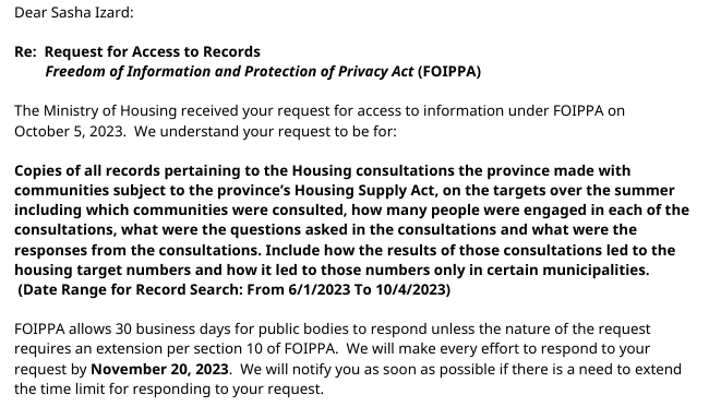 “Copies of all records pertaining to the Housing consultations the province made with communities subject to the province’s Housing Supply Act, on the targets over the summer including which communities were consulted, how many people were engaged in each of the consultations, what were the questions asked in the consultations and what were the responses from the consultations. Include how the results of those consultations led to the housing target numbers and how it led to those numbers only in certain municipalities.