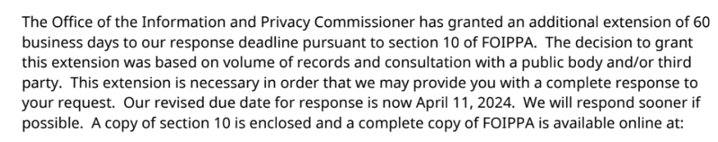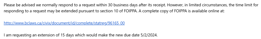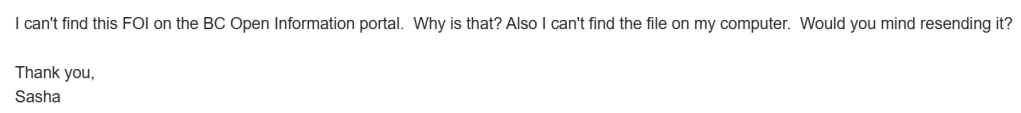 On October 10, 2023, I received acknowledgement of a Freedom of Information request that I had made to the Province of BC for: