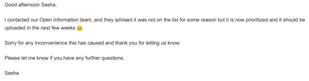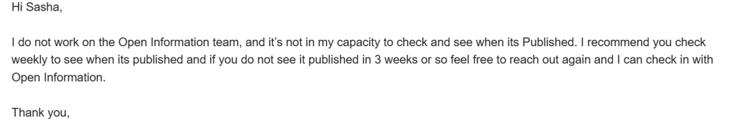 After multiple emails on the subject of it not being posted on the government’s open information catalogue, of March 7, 2025 it is still not posted.