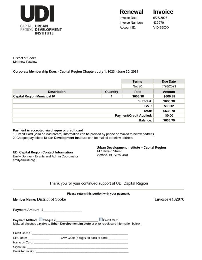 The receipt for renewing the District of Sooke’s membership with the UDI Capital Region. I was informed by Sooke’s finance department that it was paid on July 3, 2024.