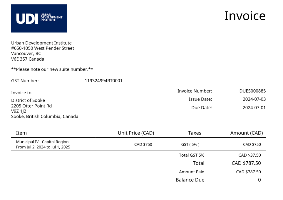 Recent invoice and receipt for the District of Sooke’s last 2 UDI memberships renewals: