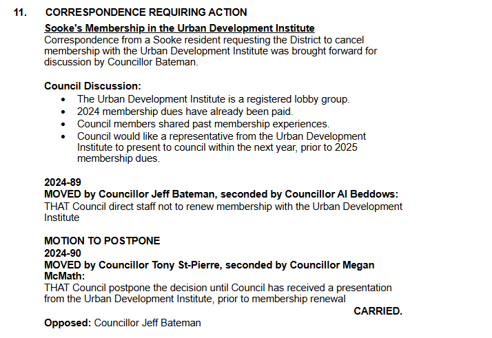 Mayor and Council were under the impression from staff that evening (March 11, 2024) that the District’s UDI membership had only recently been renewed and would last for the year. This was not correct. The membership had been renewed the previous year on July 20, 2023, as I learned today from Sooke’s finance department, and it was to expire only 4 months after the March 11, 2024 meeting.